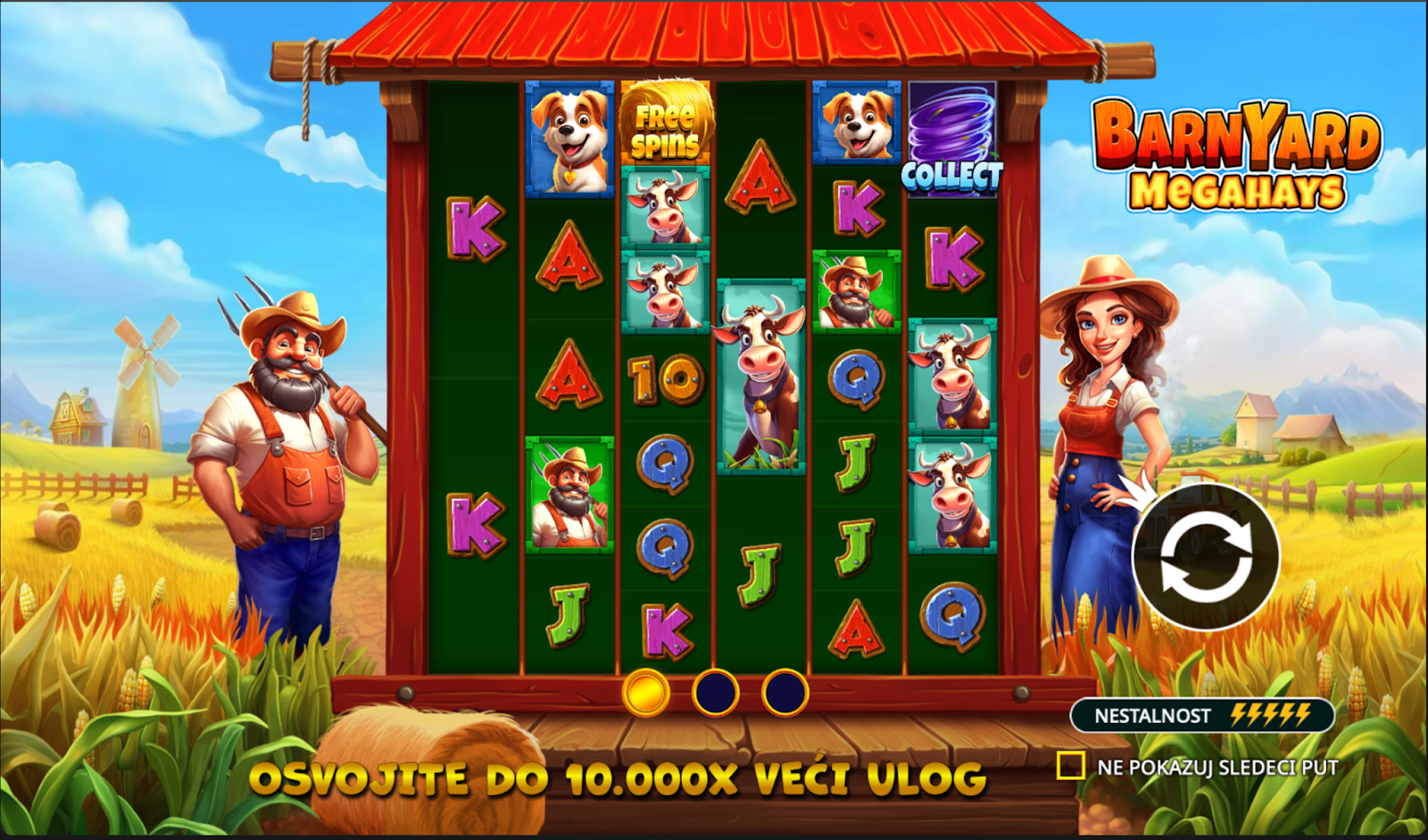 At first glance, Barnyard Megahays Megaways presents a fairytale-style farm setting: golden cornfields, cheerful farmers, and friendly farm animals ready to deliver winnings. Beneath this bright and sunny countryside atmosphere lies a powerful Megaways engine with up to 117,649 ways to win, combined with an innovative Collect mechanic.
