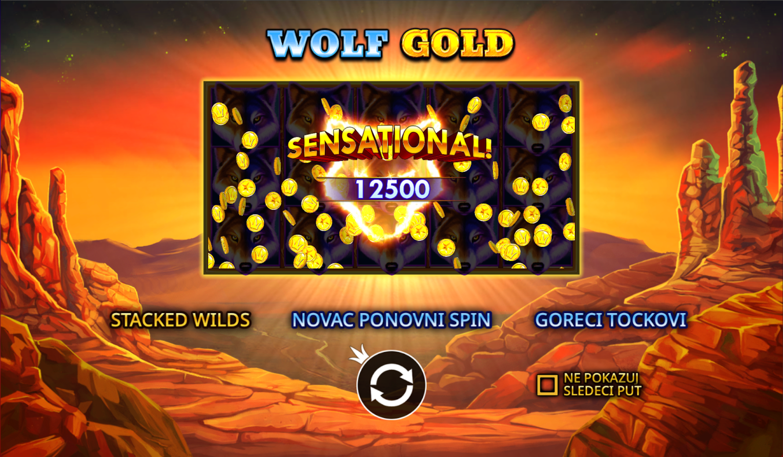 When you first launch the game, you are instantly transported to the heart of the desert under a night sky. Tall cliffs, a glowing moon, and the constant howl of wolves create a distinctive, almost meditative atmosphere. The theme is inspired by the wilderness of the American Southwest, reinforcing feelings of freedom, risk, and instinct – the core motifs of this slot.